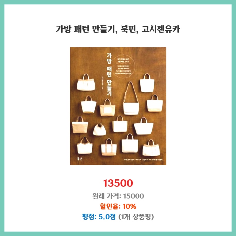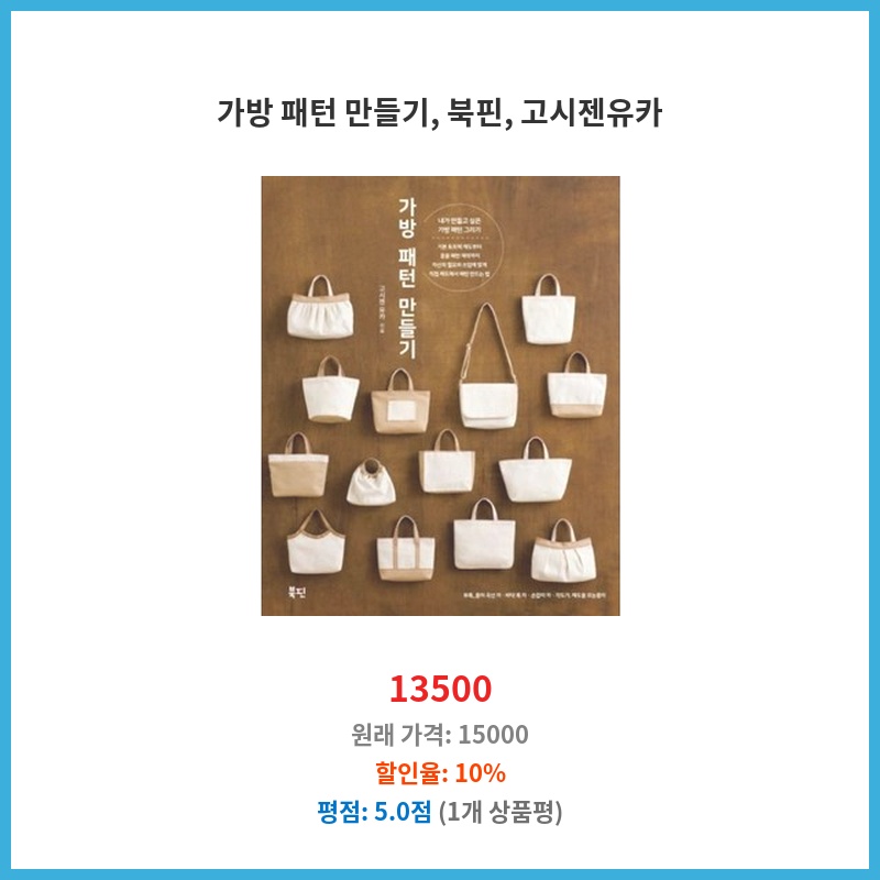 가방 만들기 패턴과 북핀, 고시젠유카까지 한번에 구매할 수 있어 편리했습니다. 패턴은 상세하고, 북핀과 고시젠유카의 품질도 좋았습니다. 만드는 재미와 완성품의 만족도를 높여줄 아이템이라 생각되어 구매했습니다.