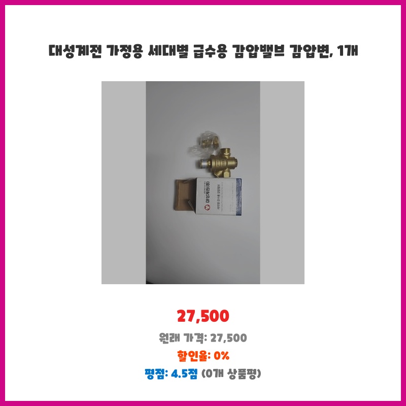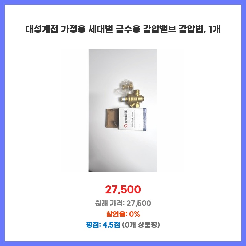 수압이 너무 높아 세탁기 및 변기 등 수도 설비에 무리가 갈까 걱정되어 구매했습니다. 대성계전 제품이라 믿을 수 있고, 가정용으로 적합한 감압 범위를 제공한다는 점이 마음에 들었습니다. 설치도 어렵지 않아 직접 할 수 있었습니다.