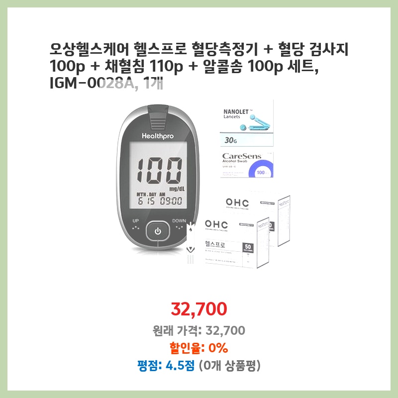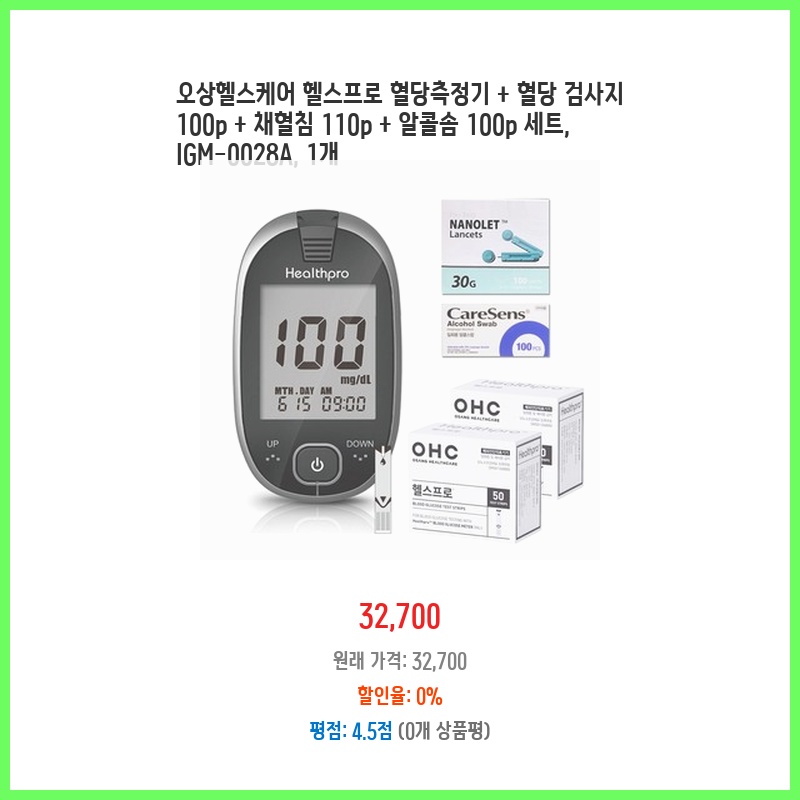 오상헬스케어 헬스프로 혈당측정기 + 혈당 검사지 100p + 채혈침 110p + 알콜솜 100p 세트, IGM-0028A, 1개