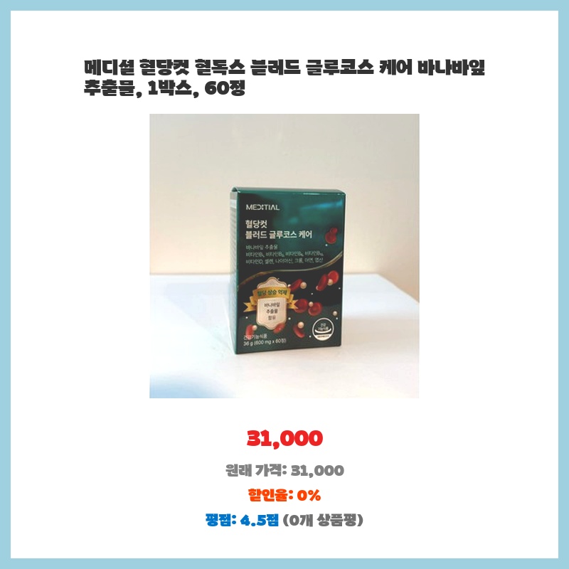 혈당 관리에 도움이 되는 바나바잎 추출물 함유 제품을 찾던 중, 메디셜 혈당컷 혈톡스를 알게 되었습니다. 합리적인 가격에 60정이라는 충분한 용량이 매력적이었고, 꾸준히 섭취하면 혈당 관리에 도움이 될 것으로 기대하여 구매했습니다.