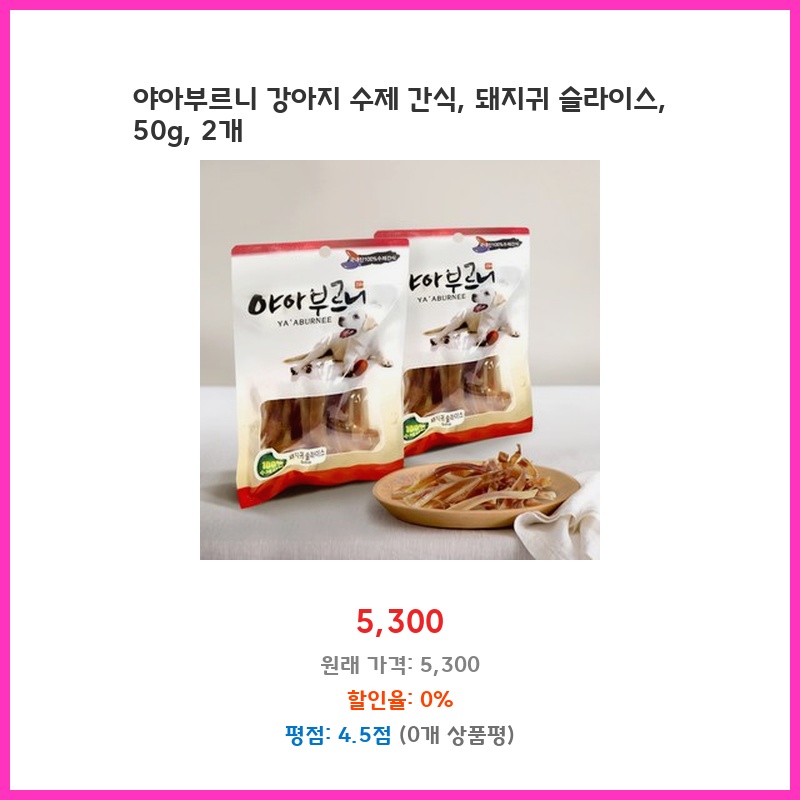 강아지가 돼지귀를 너무 좋아해서 믿을 수 있는 수제 간식을 찾던 중 야아부르니 제품을 발견했습니다. 50g 2개라 소량으로 구매해 테스트해보기에 좋았고, 슬라이스 형태라 먹기 편할 것 같아 구매했습니다. 국내산이라는 점도 안심이 되었습니다.
