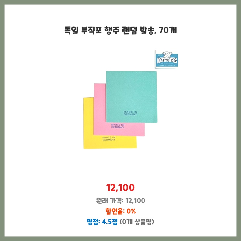 70개나 되는 행주를 한 번에 구매하니 가성비가 좋습니다. 독일산이라 품질도 믿을 수 있고, 랜덤 발송이라 색상 고민 없이 편리했습니다. 부직포라 세척도 간편하고, 여러 용도로 활용 가능할 것 같아요.