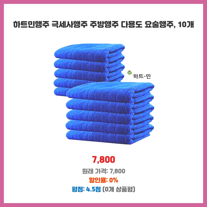 10개에 7,800원이라는 저렴한 가격에 극세사 소재의 행주를 넉넉하게 구비할 수 있어서 구매했습니다. 흡수력이 좋고, 여러 용도로 사용 가능하다는 점이 매력적이었습니다. 다용도로 사용하기에 부담 없는 가격이라 만족스러워요.