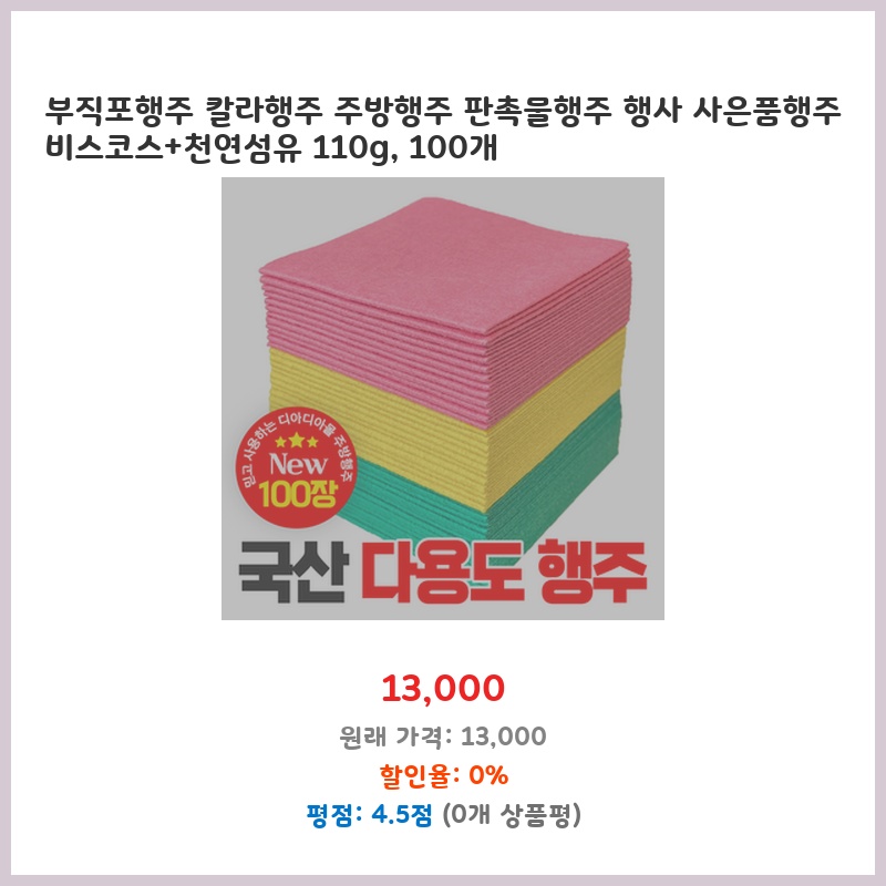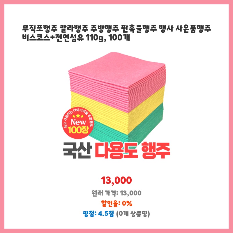 부직포행주 칼라행주 주방행주 판촉물행주 행사 사은품행주 비스코스+천연섬유 110g, 100개