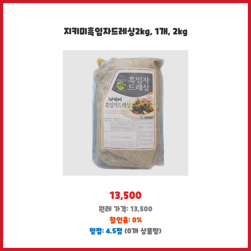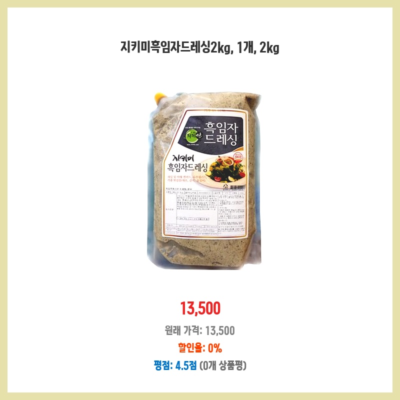 넉넉한 2kg 용량에 가격도 합리적이라 선택했습니다. 흑임자 특유의 고소함이 강하고, 다른 드레싱과 달리 깔끔한 맛이라 여러 요리에 활용하기 좋을 것 같아 구매했습니다. 다른 첨가물이 적어 건강에도 신경 쓴 점이 마음에 들었습니다.