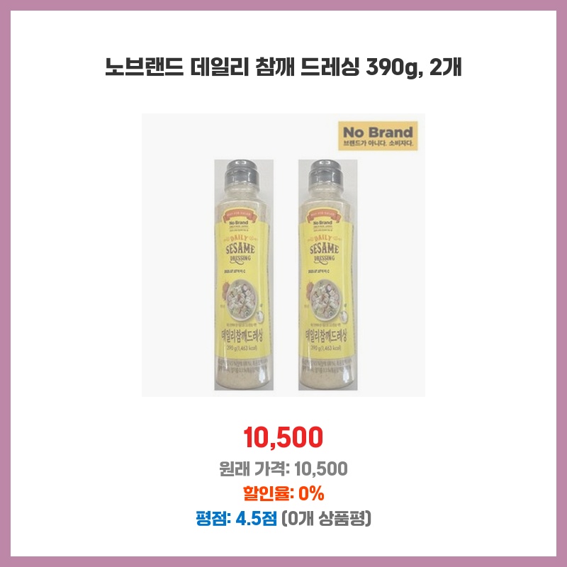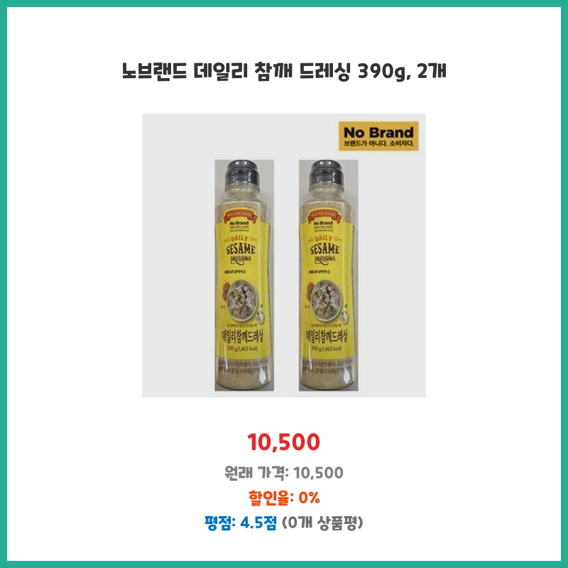 가성비 좋은 참깨 드레싱을 찾던 중 노브랜드 제품을 발견했습니다. 용량도 넉넉하고, 2개 세트라 더욱 경제적이어서 구매했습니다. 평소 참깨 드레싱을 자주 사용하는 편이라 대용량이 필요했는데, 만족스러운 선택이었습니다.