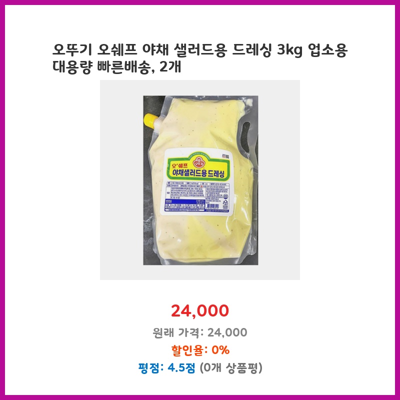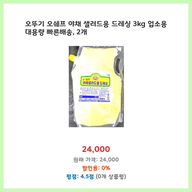 업소용으로 야채 샐러드를 많이 만들어 사용하는데, 3kg 대용량이라 경제적이고, 오뚜기 제품이라 믿을 수 있어 구매했습니다. 빠른 배송도 장점입니다. 2개 구매로 더욱 편리하게 사용할 수 있습니다.