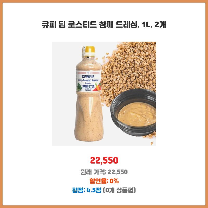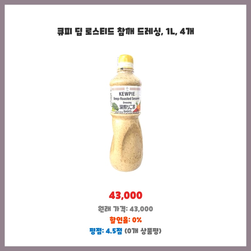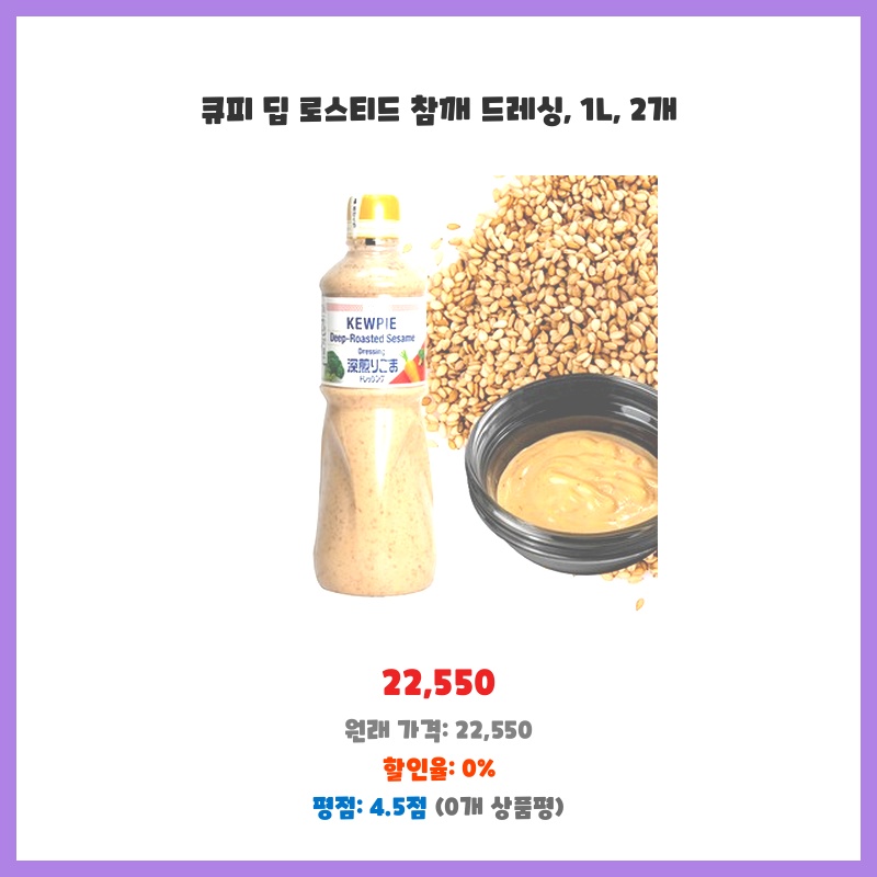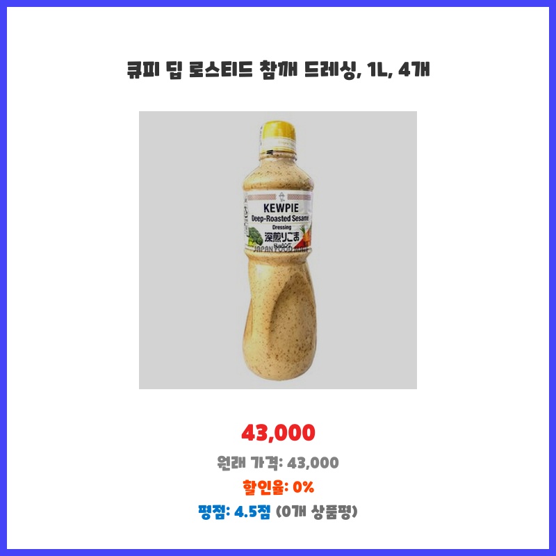 넉넉한 1L 용량에 참깨 드레싱을 좋아해서 2개 구매했습니다. 큐피 브랜드라 믿고 사용하며, 딥 로스티드라 풍미가 깊을 것으로 예상되어 선택했습니다. 가격 대비 양이 많아 경제적입니다.