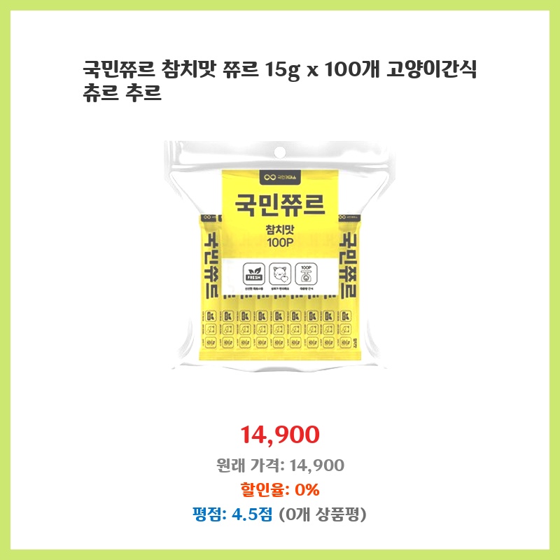 우리 고양이가 참치맛을 너무 좋아해서 츄르를 찾던 중 가성비 좋은 국민쮸르를 발견했습니다. 100개나 들어있어 오래 먹일 수 있고, 개별 포장이라 위생적이고 휴대도 간편합니다. 양도 적당해서 간식으로 주기 좋습니다.