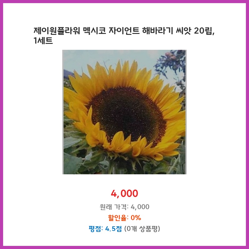 아이들과 함께 해바라기를 키우며 성장 과정을 관찰하고 싶어서 구매했습니다. 멕시코 자이언트 품종이라 크게 자라는 모습을 기대하며, 20립이면 충분히 여러 개를 심어볼 수 있을 것 같아 선택했습니다. 씨앗의 상태도 좋아 보였습니다.