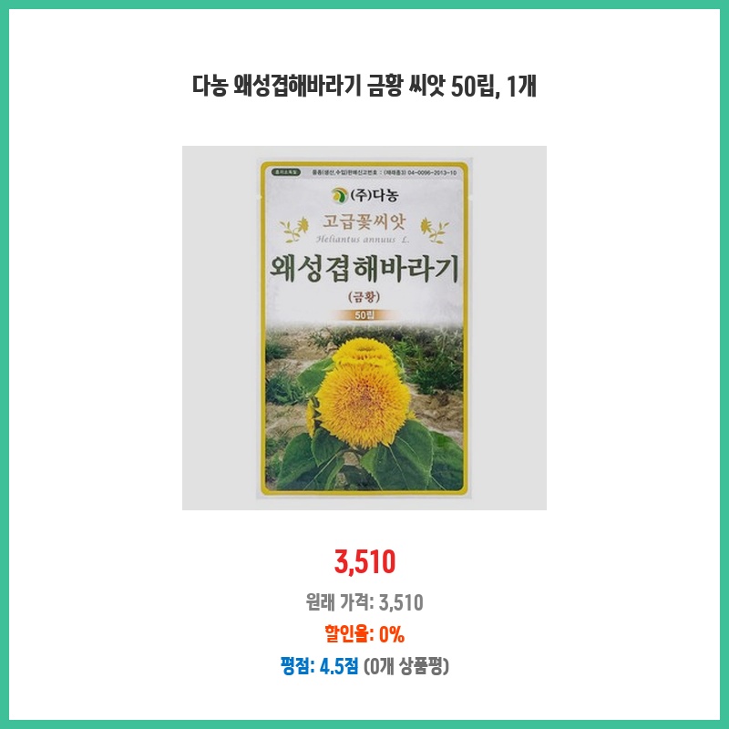 아이들과 함께 해바라기를 키워보고 싶어서 구매했습니다. 왜성 품종이라 공간 제약 없이 키울 수 있고, 금황 품종이라 꽃이 예쁠 것 같아 기대됩니다. 50립이면 충분히 여러 개 심어볼 수 있을 것 같습니다.
