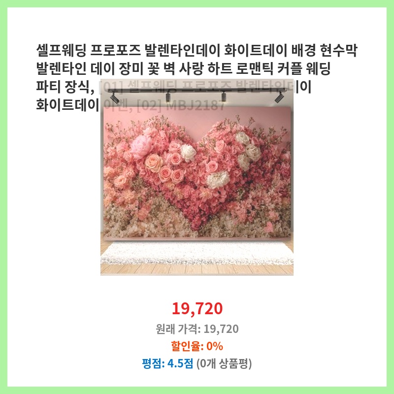 셀프웨딩 프로포즈를 계획 중이었는데, 분위기 있는 배경이 필요했습니다. 이 상품은 가격 대비 퀄리티가 좋아 보였고, 장미와 하트 디자인이 마음에 들어 구매했습니다. 설치도 간편할 것 같아 선택했습니다.