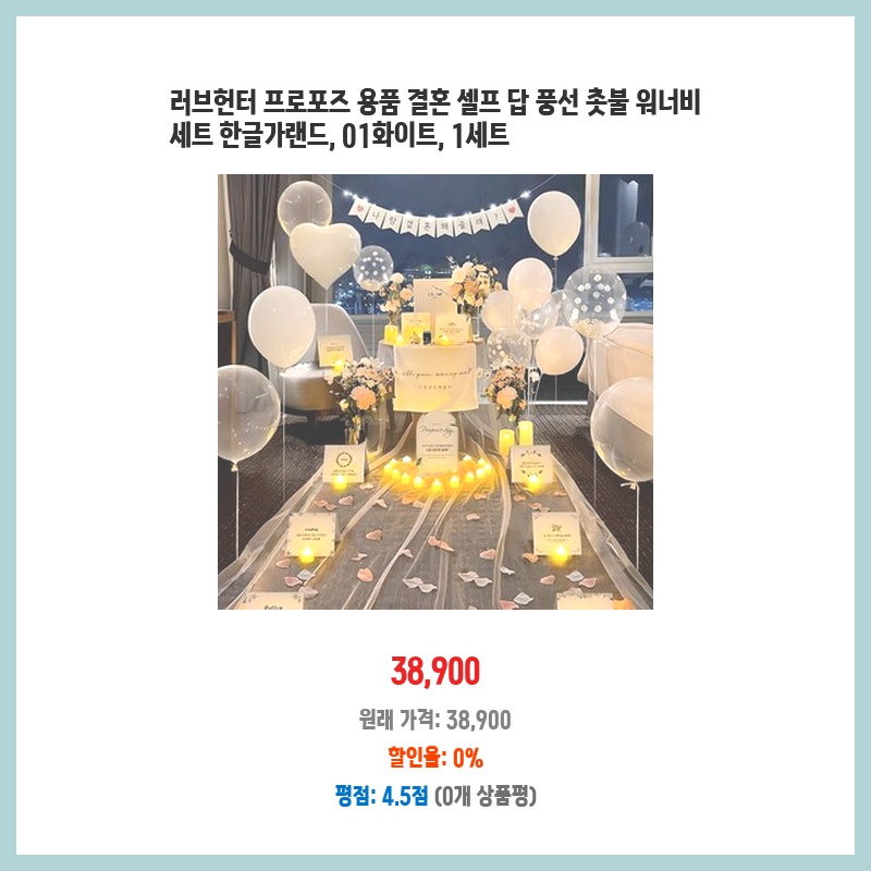 프로포즈 준비에 필요한 모든 용품이 한 세트로 구성되어 편리했습니다. 풍선, 촛불, 가랜드까지 고급스러운 화이트 톤으로 통일되어 있어 분위기 연출이 쉬웠습니다. 가성비도 좋은 편이라고 생각합니다.