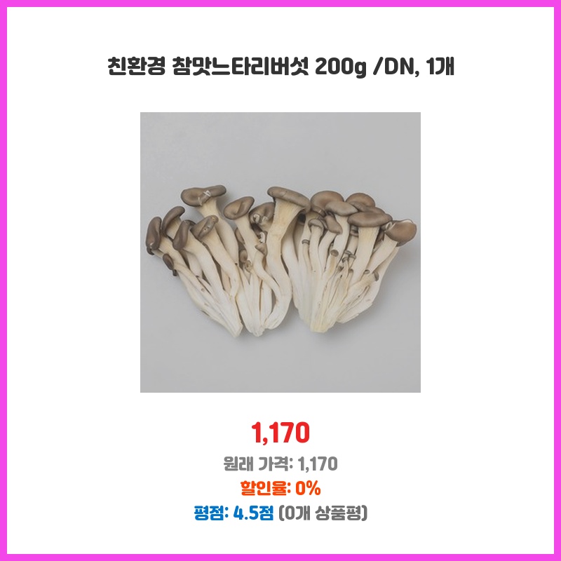 국내산 친환경 느타리버섯이라 믿고 먹을 수 있어서 구매했습니다. 200g 소포장이라 12인 가구에 적당하고, 버섯 특유의 향이 진하고 신선해서 좋았습니다. 다양한 요리에 활용하기 편리했습니다.