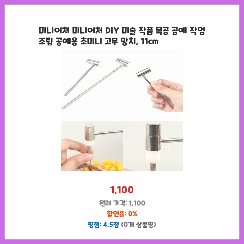 미니어처 작업에 꼭 필요한 고무망치를 찾던 중, 크기가 적당하고 가격도 저렴해서 구매했습니다. 작업 시 손목에 무리가 가지 않아 좋습니다. 11cm 사이즈가 다양한 미니어처 작업에 적합해 보였습니다.