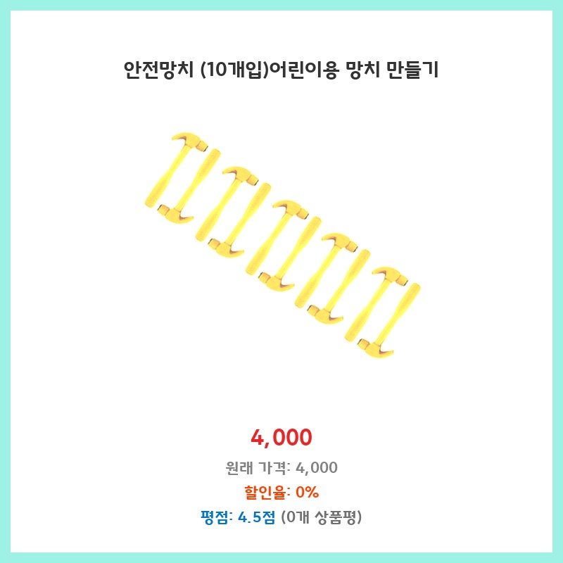 유치원에서 아이들과 망치질 활동을 계획 중이었는데, 안전한 망치가 필요했습니다. 10개입이라 아이들 수에 맞춰 준비할 수 있고, 가격도 부담 없어서 구매했습니다. 어린이용이라 안전하게 사용할 수 있다는 점이 가장 큰 장점입니다.