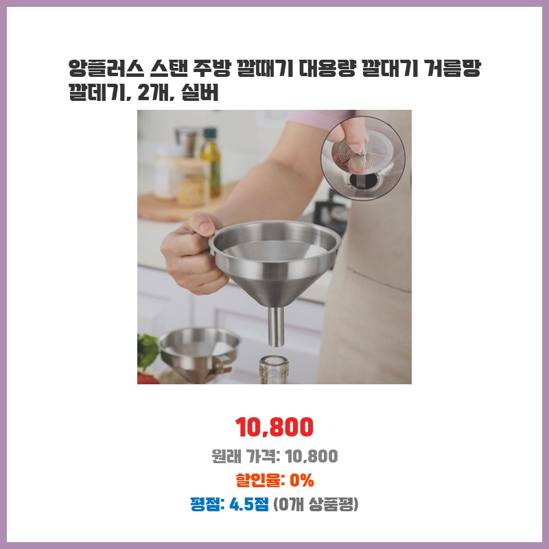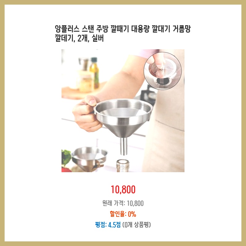 깔때기 크기와 사용 용도를 미리 확인하고, 거름망의 촘촘함을 체크하세요. 세척 방법도 확인하는 것이 좋습니다.