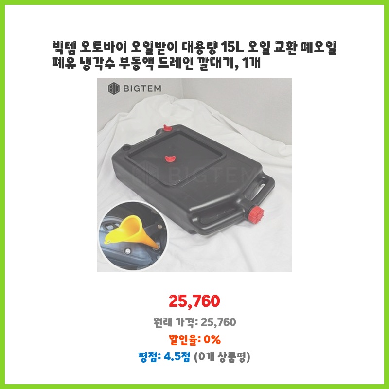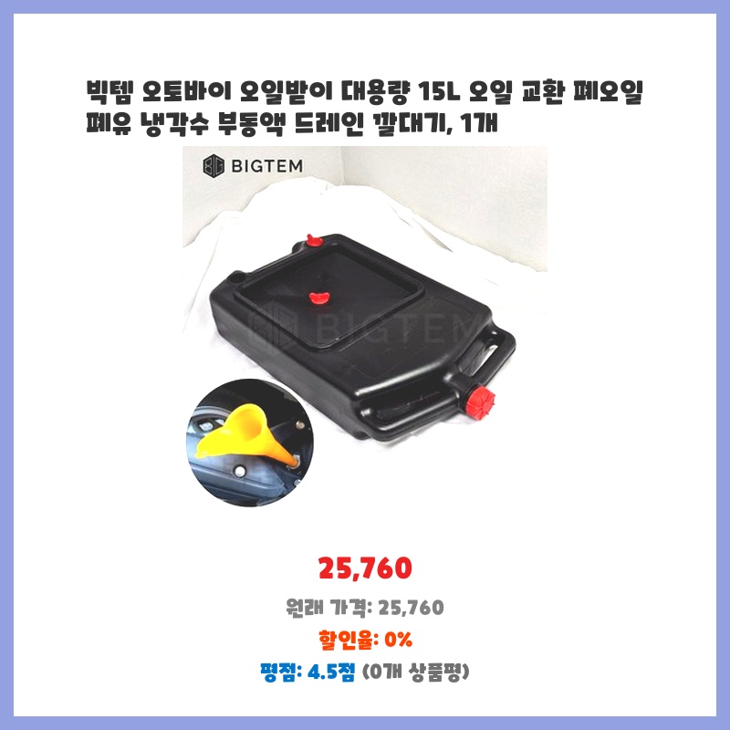 15L 대용량으로 자주 오일 교환할 필요 없어 편리하고, 폐유, 냉각수 등 다용도로 사용 가능해서 좋습니다. 넓은 받이 면적과 깔대기로 오일 쏟을 염려 없이 안전하게 작업할 수 있을 것 같아 구매했습니다.