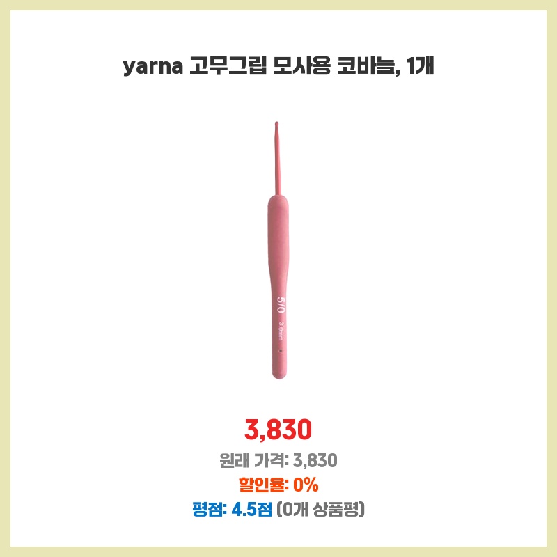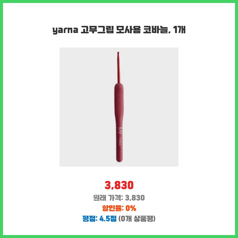 손목에 무리가 가지 않도록 고무 그립이 달린 코바늘을 찾고 있었습니다. yarna 제품은 그립감이 좋고, 뜨개질 시 손가락에 무리가 덜 가는 편이라 구매했습니다. 무게도 적당하고, 1개만 구매해도 가격이 부담스럽지 않았습니다.