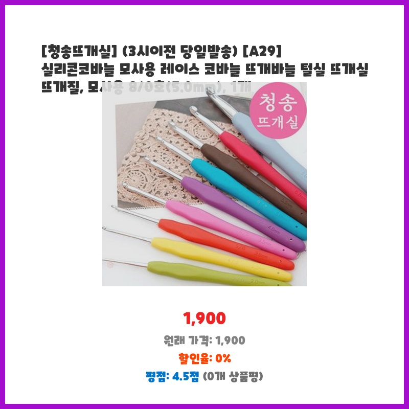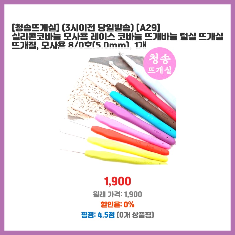 [청송뜨개실] (3시이전 당일발송) [A29] 실리콘코바늘 모사용 레이스 코바늘 뜨개바늘 털실 뜨개실 뜨개질, 모사용 8/0호(5.0mm), 1개