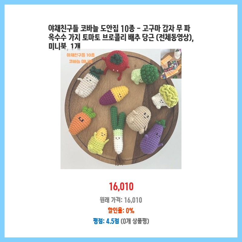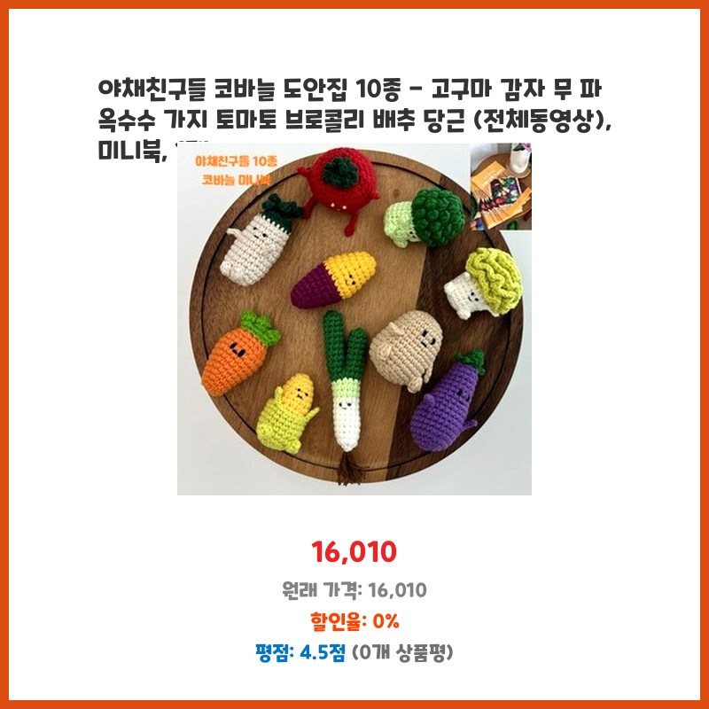 야채친구들 코바늘 도안집 10종 - 고구마 감자 무 파 옥수수 가지 토마토 브로콜리 배추 당근 (전체동영상), 미니북, 1개