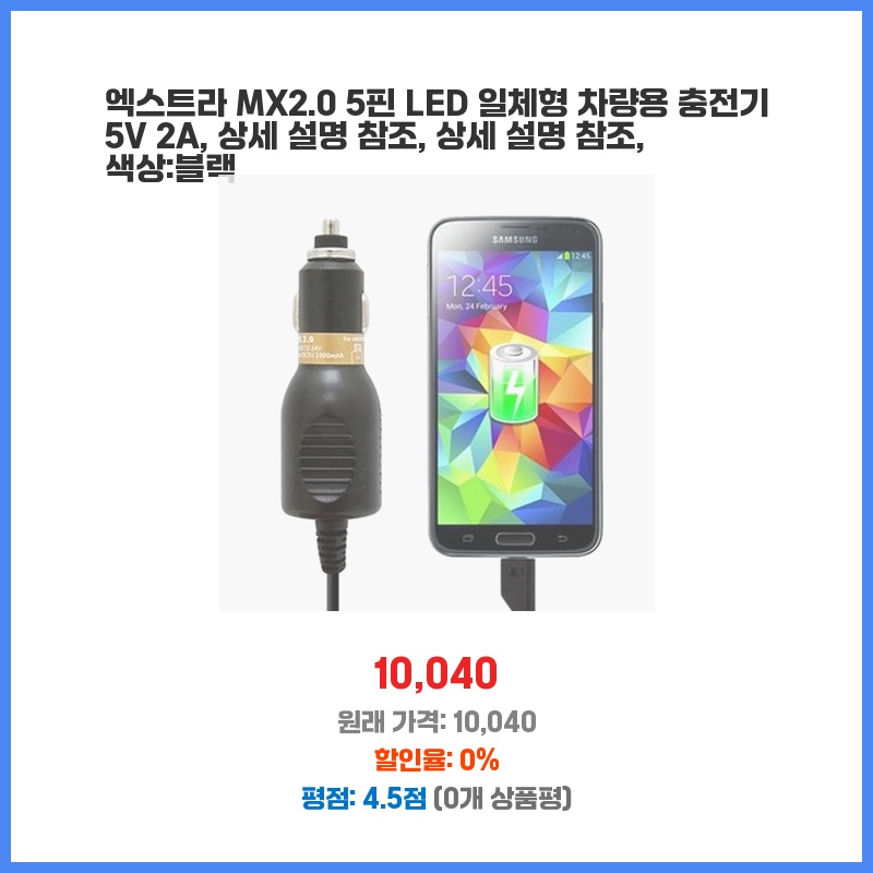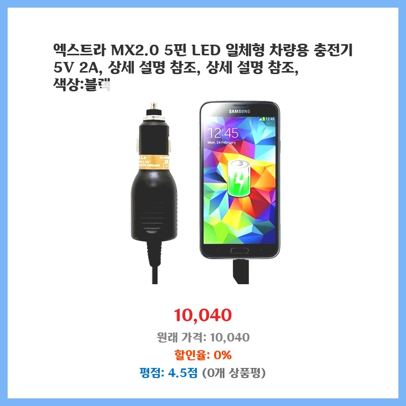 차량용 충전기가 필요했는데, 5핀과 LED 표시등이 함께 있어 편리할 것 같아 구매했습니다. 깔끔한 디자인과 2A의 충전 속도도 마음에 들었습니다. 가격 대비 성능이 좋아 보였습니다.