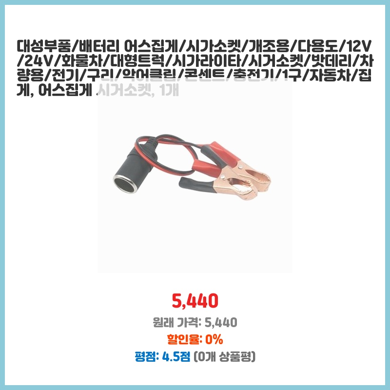 대성부품/배터리 어스집게/시가소켓/개조용/다용도/12V/24V/화물차/대형트럭/시가라이타/시거소켓/밧데리/차량용/전기/구리/악어클립/콘센트/충전기/1구/자동차/집게, 어스집게 시거소켓, 1개