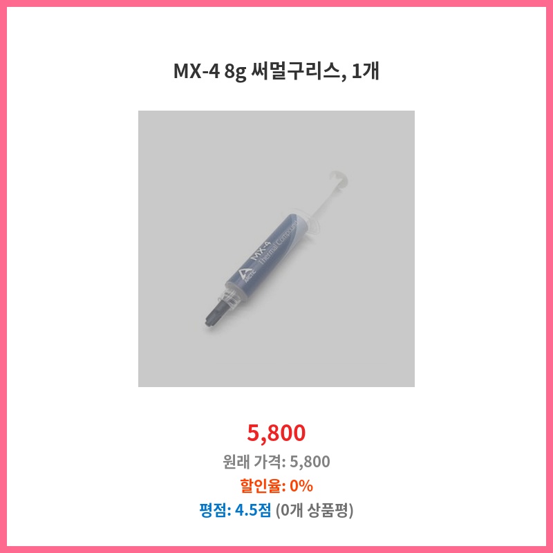 기존 써멀구리스 성능 저하로 CPU 온도 상승이 우려되어 교체했습니다. MX-4는 뛰어난 열전도율과 안정성으로 유명하여 선택했습니다. 장기간 사용 가능하고, 가격 대비 성능이 우수하다는 평이 많아 구매했습니다.