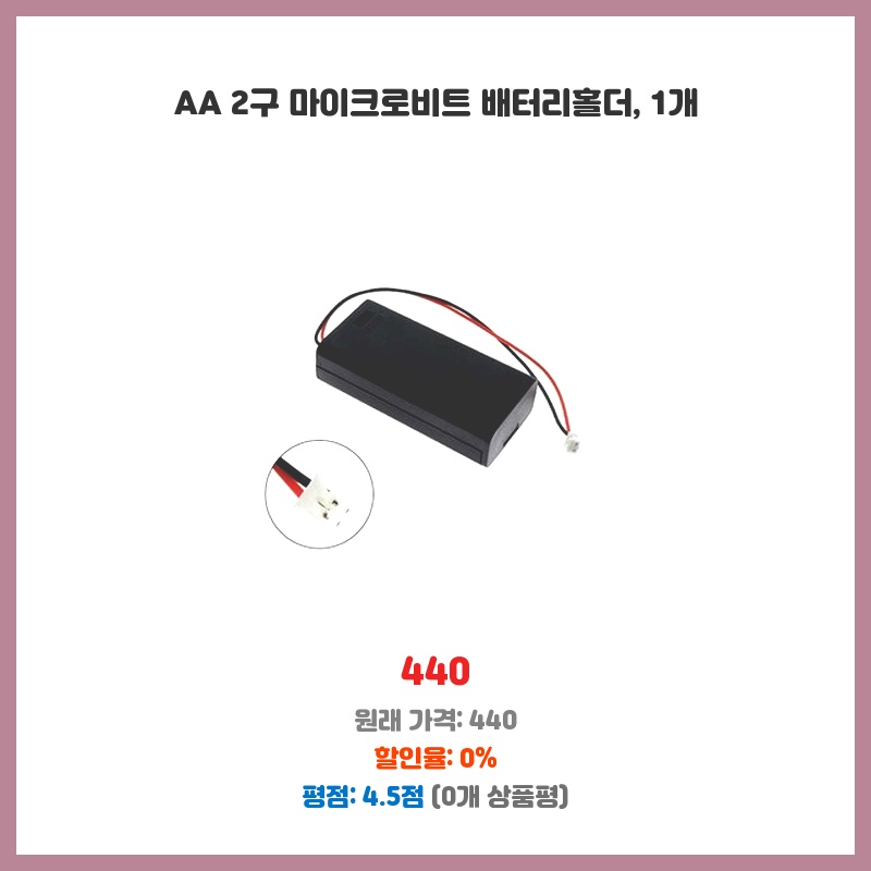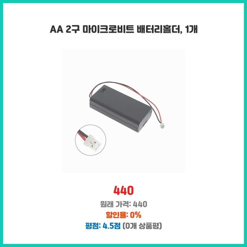 마이크로비트 프로젝트에 필요한 배터리 홀더를 찾던 중 가격이 저렴하고 2구라 편리해 구매했습니다. AA 건전지 사용으로 구하기 쉬운 점도 좋았습니다. 크기도 적당하고, 직접 연결하기 편리했습니다.