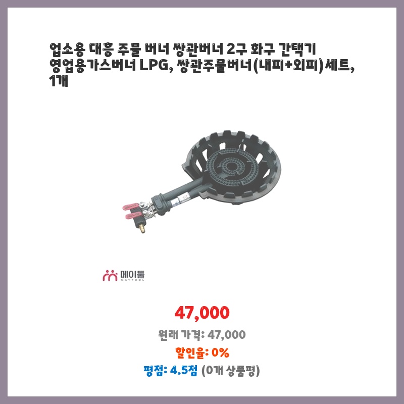 업소용으로 튼튼하고 안정적인 버너가 필요했습니다. 주물 재질이라 내구성이 좋아 보이고, 전체 액세서리 세트 포함이라 따로 구매할 필요가 없어 편리할 것 같아 구매했습니다. 천연가스 버전이라 안전하게 사용할 수 있을 것 같습니다.