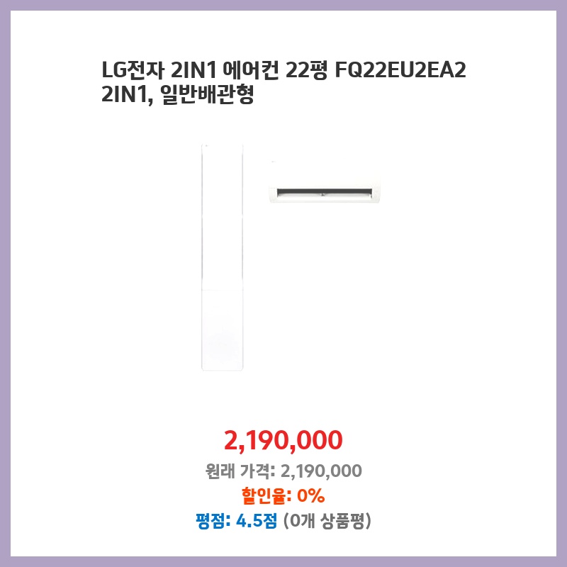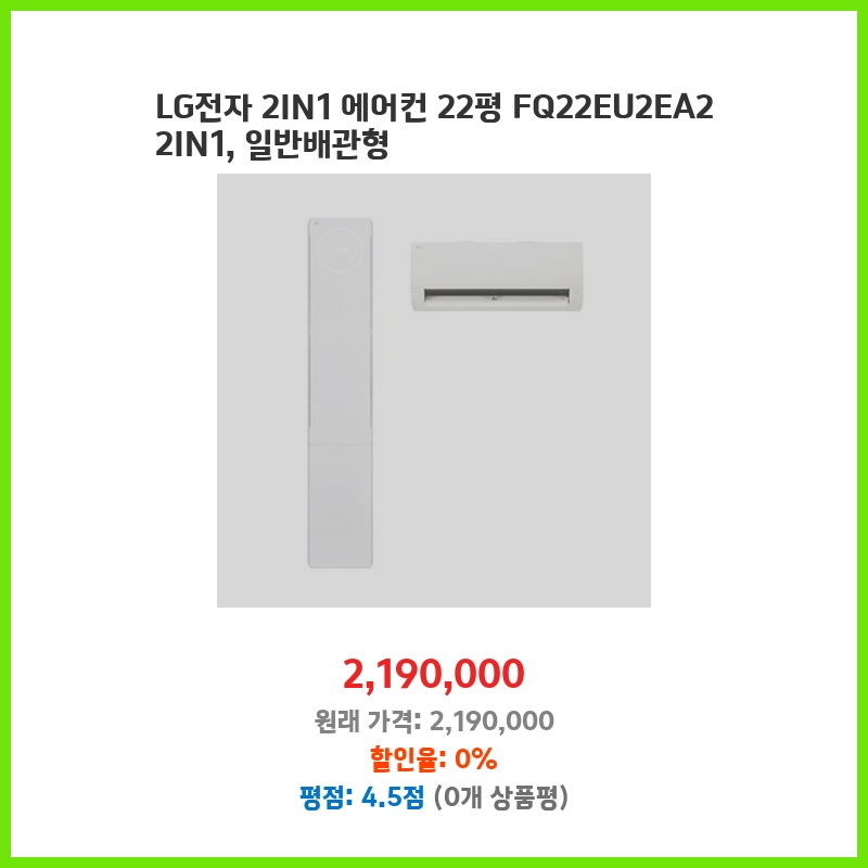22평형이라 넓은 거실을 시원하게 해줄 에어컨이 필요했어요. LG 2IN1 모델은 냉난방 모두 가능하고, 일반 배관형이라 설치도 편리할 것 같아 선택했습니다. 에너지 효율도 중요하게 생각했는데, 이 제품이 성능 대비 가격이 합리적이라고 판단했습니다.