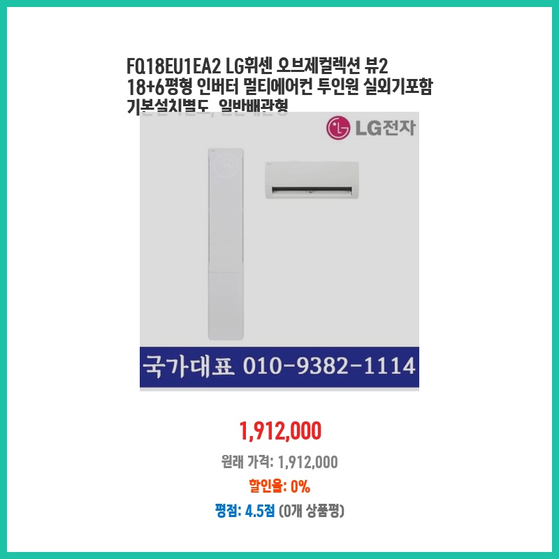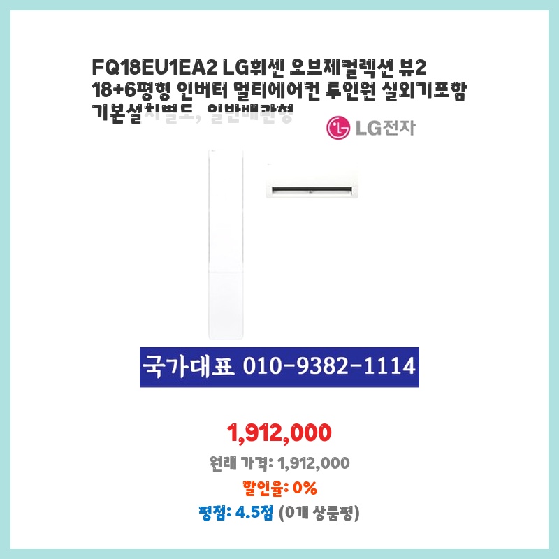 FQ18EU1EA2 LG휘센 오브제컬렉션 뷰2 18+6평형 인버터 멀티에어컨 투인원 실외기포함 기본설치별도, 일반배관형