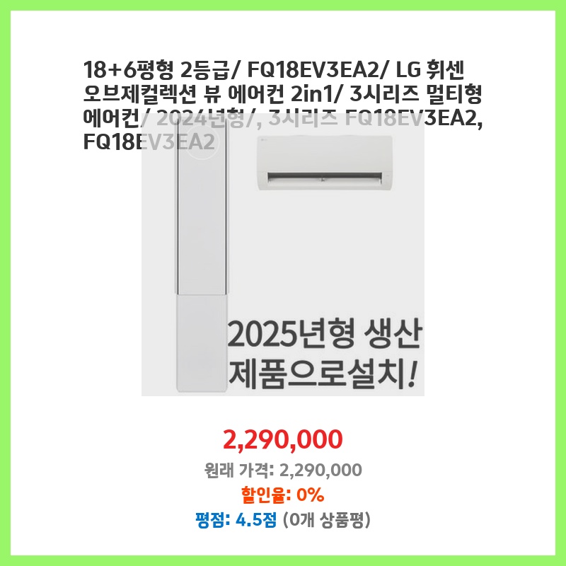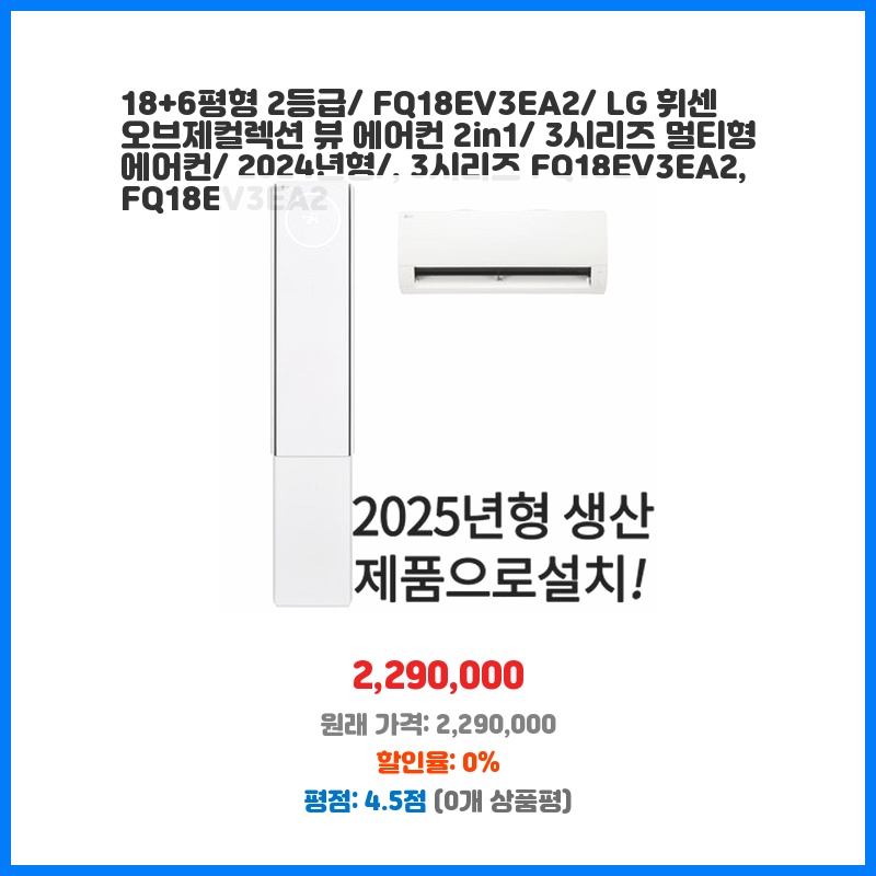 18+6평형 2등급/ FQ18EV3EA2/ LG 휘센 오브제컬렉션 뷰 에어컨 2in1/ 3시리즈 멀티형 에어컨/ 2024년형/, 3시리즈 FQ18EV3EA2, FQ18EV3EA2