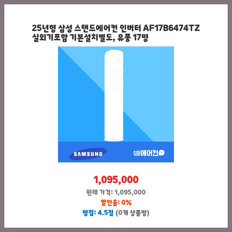 25년형 삼성 스탠드에어컨 인버터 AF17B6474TZ 실외기포함 기본설치별도, 유풍 17평