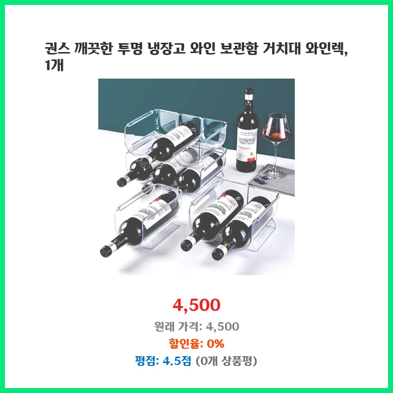 냉장고 안이 깔끔해 보이고 와인을 보기 좋게 정리하고 싶어서 구매했습니다. 투명 소재라 와인을 쉽게 찾을 수 있고, 4,500원이라는 저렴한 가격에 만족스럽습니다. 공간 활용도도 좋아 보였습니다.