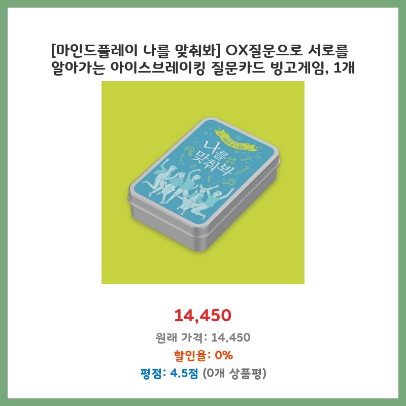 팀워크 향상을 위해 아이스브레이킹 게임이 필요했는데, OX 질문 방식이라 부담 없이 참여할 수 있고, 빙고 게임 형식으로 재미있게 진행할 수 있을 것 같아 구매했습니다. 질문 카드의 질도 좋아 보였습니다.