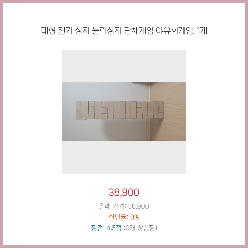 야유회나 단체 게임에 적합한 대형 젠가를 찾던 중, 튼튼하고 크기가 적당해 보여 구매했습니다. 목재 재질도 괜찮고, 여러 명이 함께 즐길 수 있어 만족스러울 것 같습니다.