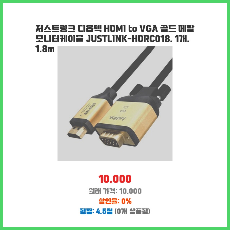 노트북의 HDMI 출력을 통해 데스크탑 모니터(VGA 입력)를 사용하고 싶어서 구매했습니다. 금속 재질이라 내구성이 좋아 보였고, 1.8m 길이도 적당했습니다. 가격 대비 품질이 만족스러웠습니다.