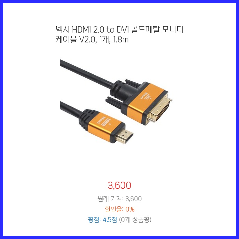 HDMI 단자만 있는 노트북을 DVI 단자의 모니터에 연결해야 해서 구매했습니다. 골드메탈 재질이라 내구성이 좋아 보이고, 1.8m 길이도 적당해서 만족스럽습니다. HDMI 2.0 지원으로 고해상도 영상 출력도 문제없었습니다.