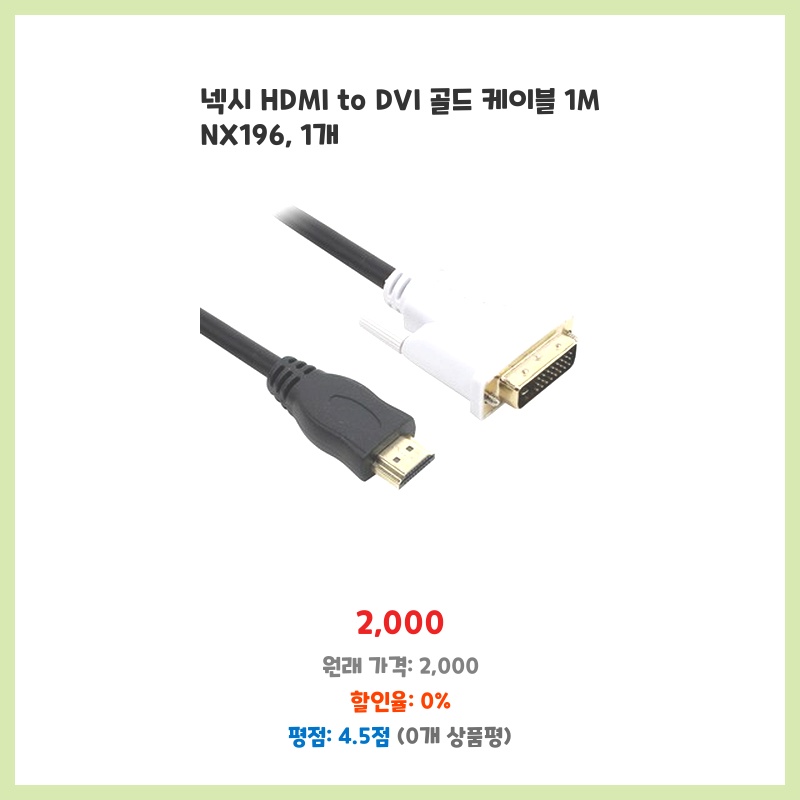 HDMI 단자만 있는 노트북을 DVI 단자의 모니터에 연결해야 해서 구매했습니다. 가격도 저렴하고 1m 길이라 책상 위에서 사용하기에 적절한 길이입니다. 금도금 단자라 접촉 불량 걱정도 덜어서 좋았습니다.