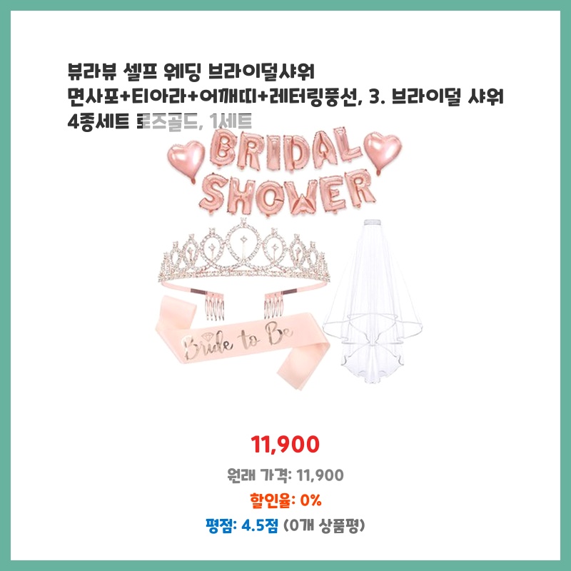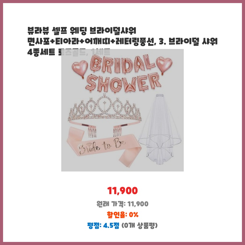 브라이덜 샤워를 준비하면서 따로따로 구매하는 것보다 가성비 좋게 세트로 구매할 수 있어서 좋았습니다. 로즈골드 색상도 예쁘고, 면사포, 티아라, 어깨띠, 풍선까지 구성이 알차서 만족스러웠습니다. 필요한 소품들을 한 번에 해결할 수 있어 편리했습니다.