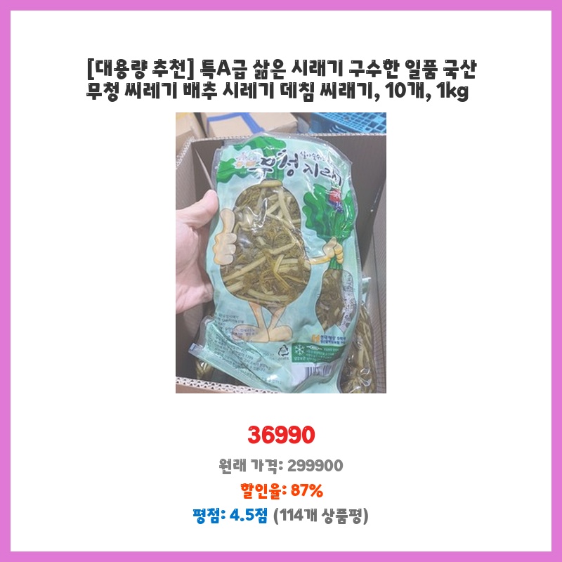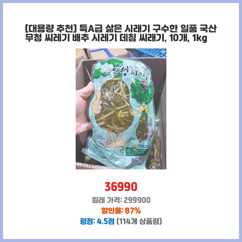 1kg에 10개나 들어있어 가성비가 좋고, 국산 무청 시래기라 믿을 수 있어요. 삶아서 데친 상태라 바로 요리에 사용 가능한 점이 편리합니다. 특A급이라 품질도 좋을 것 같아 구매했습니다.