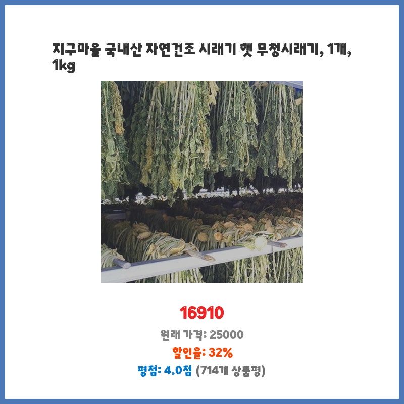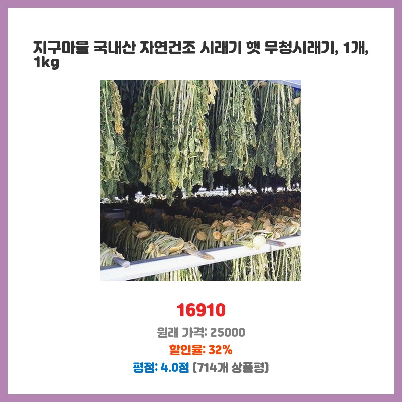 국내산 무청으로 만들어 믿음직하고, 자연건조 방식이라 깔끔하고 맛있을 것 같아 구매했습니다. 1kg이면 넉넉하게 사용할 수 있을 것 같아 좋습니다. 시래기 요리에 자주 활용하고 싶어서 선택했습니다.