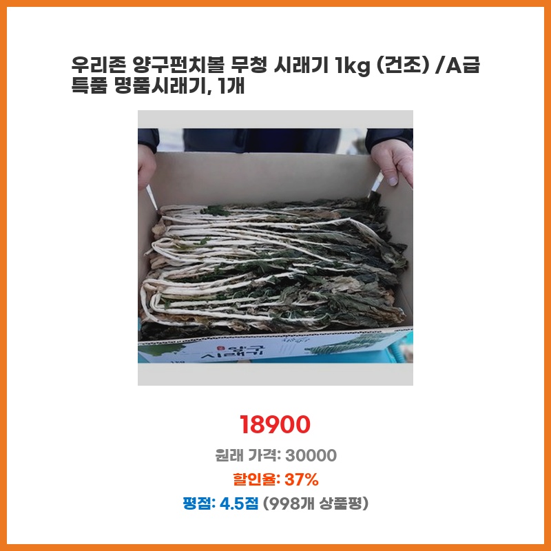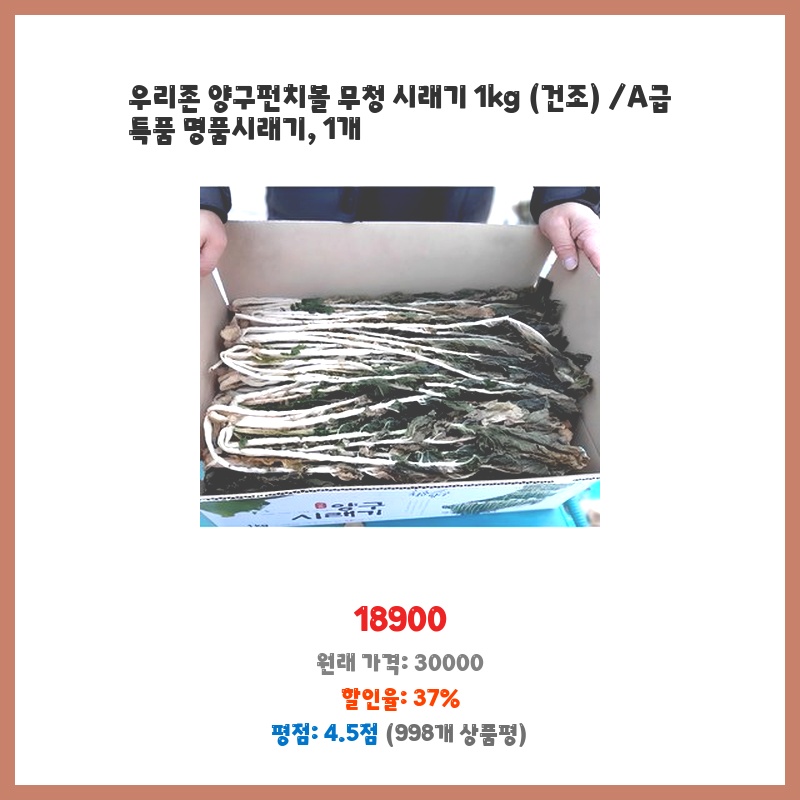 깔끔한 포장과 A급 특품이라는 점에 끌려 구매했습니다. 양구산 무청 시래기라 믿음직하고, 1kg이면 우리 가족이 넉넉하게 먹을 수 있을 것 같아요. 건조 시래기라 보관도 편리할 것 같습니다.