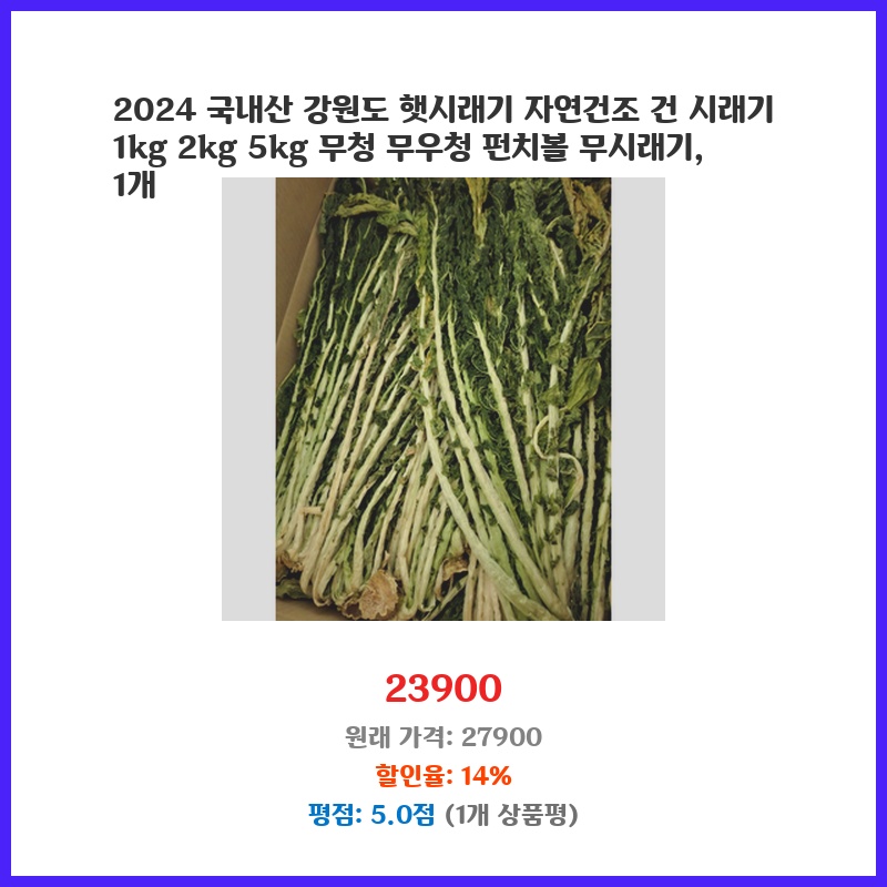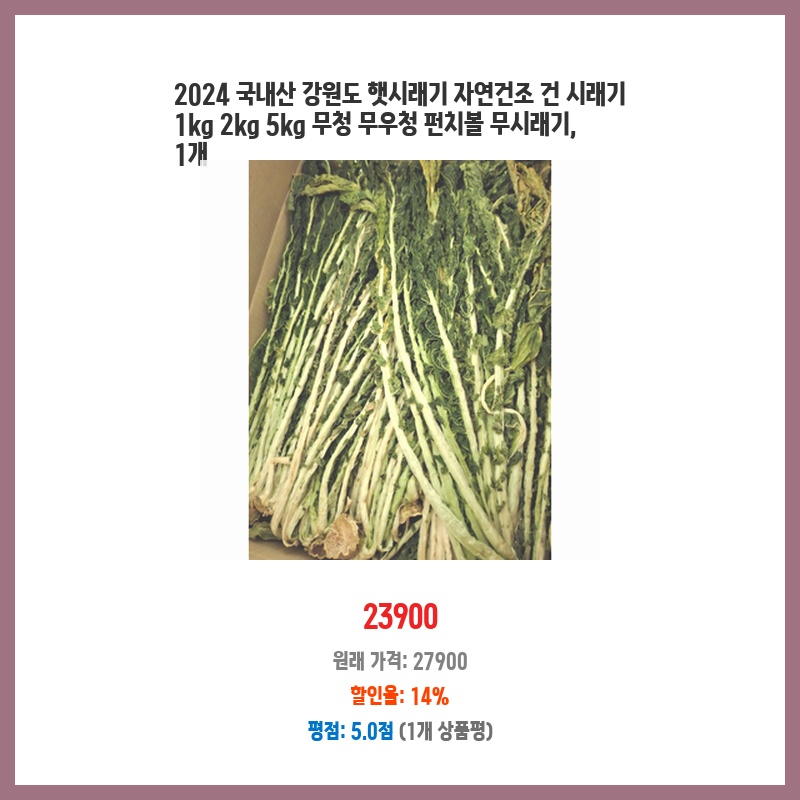 깔끔하게 자연건조된 강원도산 햇시래기라 믿음직스러워 구매했습니다. 1kg, 2kg, 5kg 다양한 용량 선택이 가능해서 좋았고, 펀치볼 무시래기라 맛이 기대됩니다. 국내산이라 안심하고 먹을 수 있을 것 같아요.