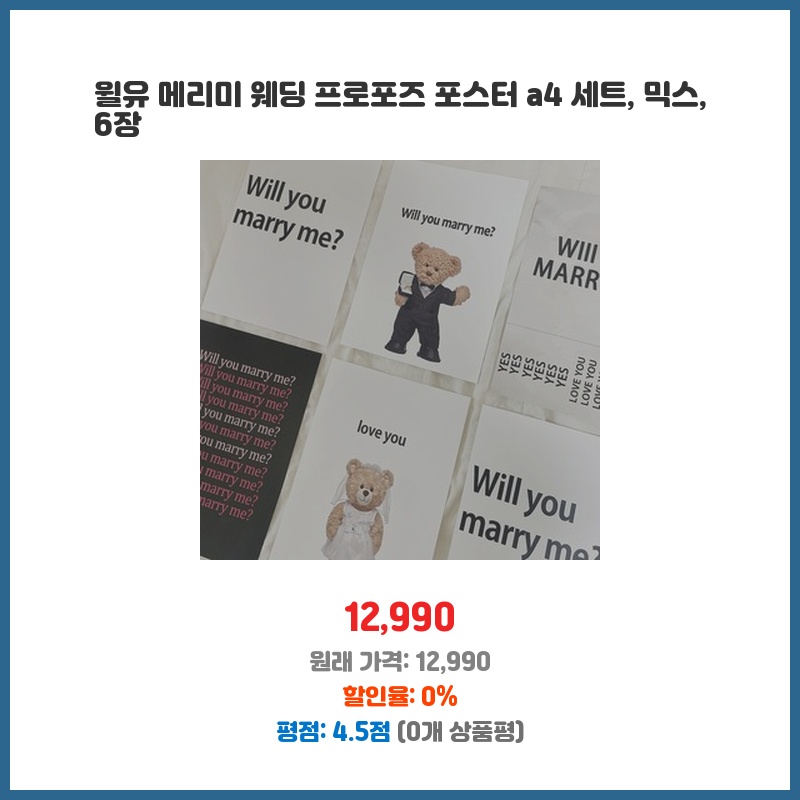 윌유 메리미 웨딩 프로포즈 포스터 a4 세트, 믹스, 6장