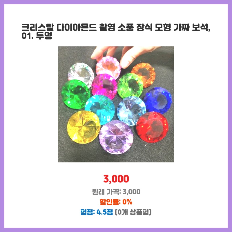 사진 촬영 소품으로 다이아몬드를 활용하고 싶었는데, 실제 다이아몬드는 부담스러워 가짜 보석을 찾던 중 가격도 저렴하고 투명도가 높아 구매했습니다. 크기가 적당해서 다양한 연출이 가능할 것 같습니다.