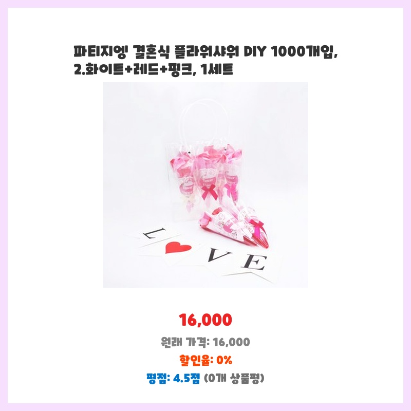 결혼식 하객들에게 나눠줄 셀프 플라워샤워 용품을 찾던 중 가격 대비 양이 많고 색상도 다양해서 구매했습니다. 1000개나 들어있어서 여유롭게 사용할 수 있을 것 같아 만족스럽습니다. 직접 만들어서 나눠주니 더욱 특별한 기념품이 될 것 같아요.