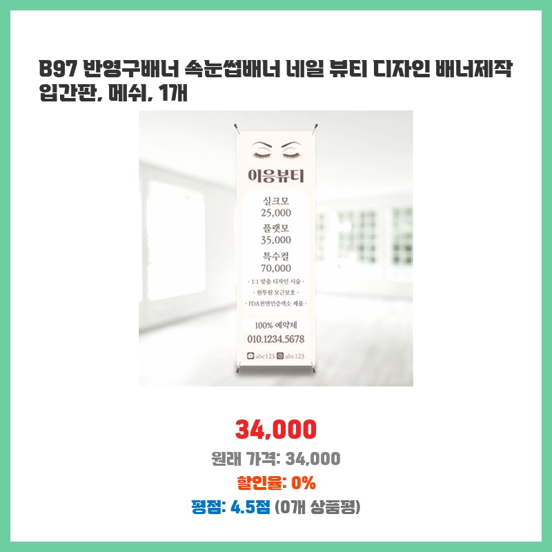 매장 홍보를 위해 반영구, 속눈썹, 네일 뷰티샵에 어울리는 배너가 필요했습니다. B97 배너는 디자인이 깔끔하고 가격 대비 품질이 좋아 선택했습니다. 내구성도 좋아 오래 사용할 수 있을 것 같습니다.