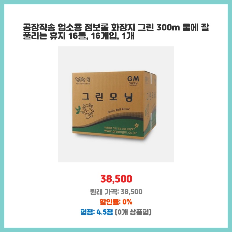 업소용으로 화장지 소모량이 많아 경제적인 제품을 찾던 중 발견했습니다. 300m의 넉넉한 길이와 16롤 구성으로 오랫동안 사용할 수 있고, 물에 잘 풀린다는 점이 마음에 들었습니다. 가격 대비 용량이 커서 만족스럽습니다.